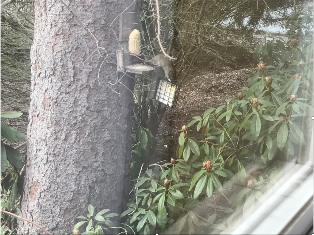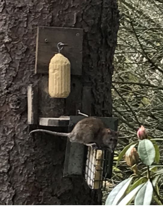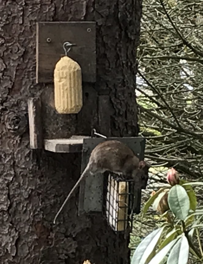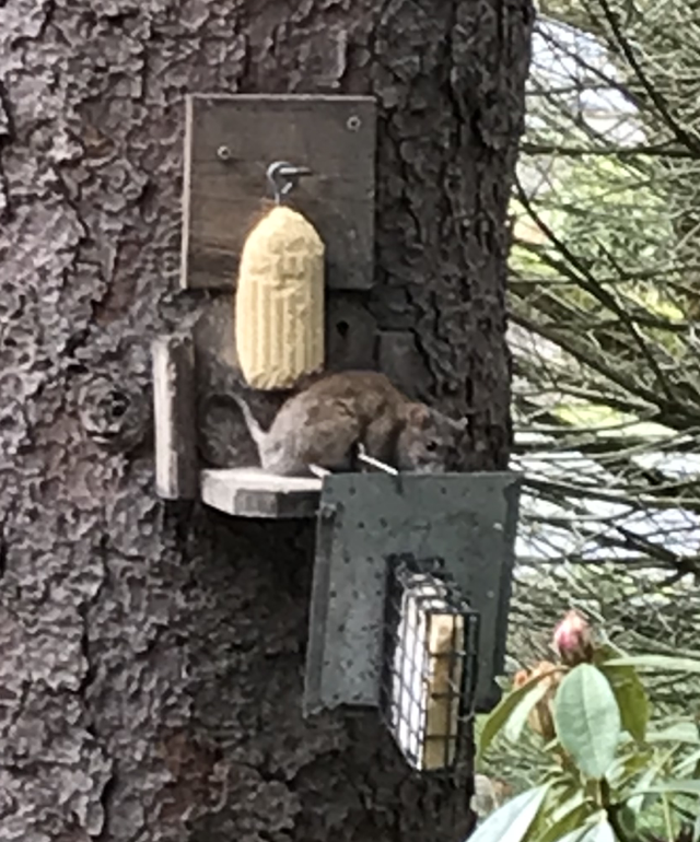 KATHERINE: I just saw this rat eating from our rat feeder, I mean bird feeder, in broad daylight, at 11:21 AM (see attached). It was not particularly reluctant to leave when I came out.